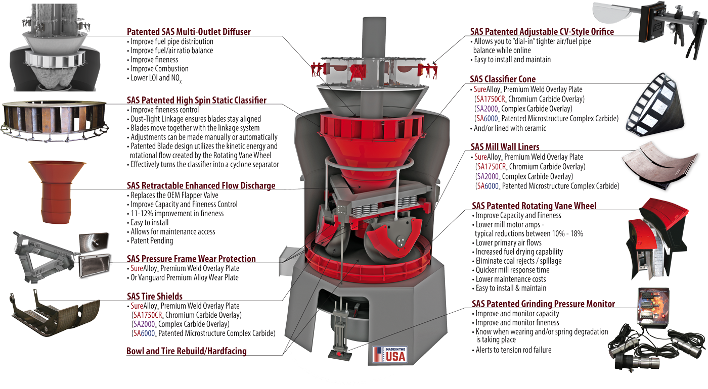 The SAS Mill Modernization program can include available patented SAS modernization technology, rebuild / installation and then fine tuning of the mill. The first phase of this program should include a complete Mill inspection and accurate coal pipe testing which will establish baseline data. The information gained will include coal pipe balance, coal fineness, air/coal ratios, as well as the condition of the grinding components, mill throat, classifier, springs, and other components.