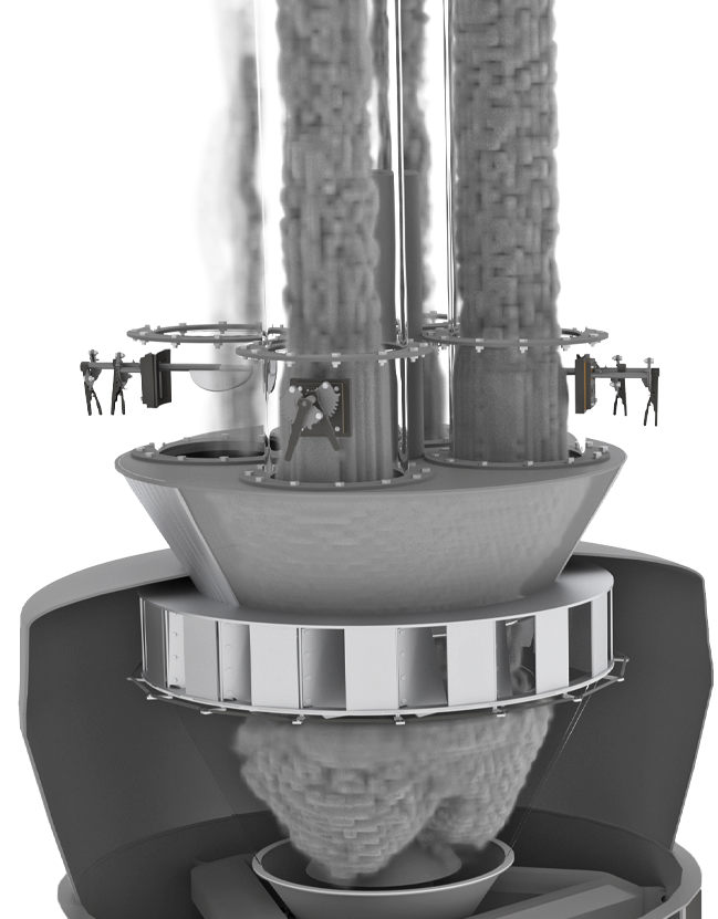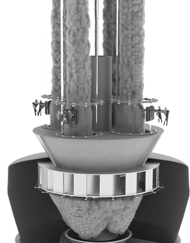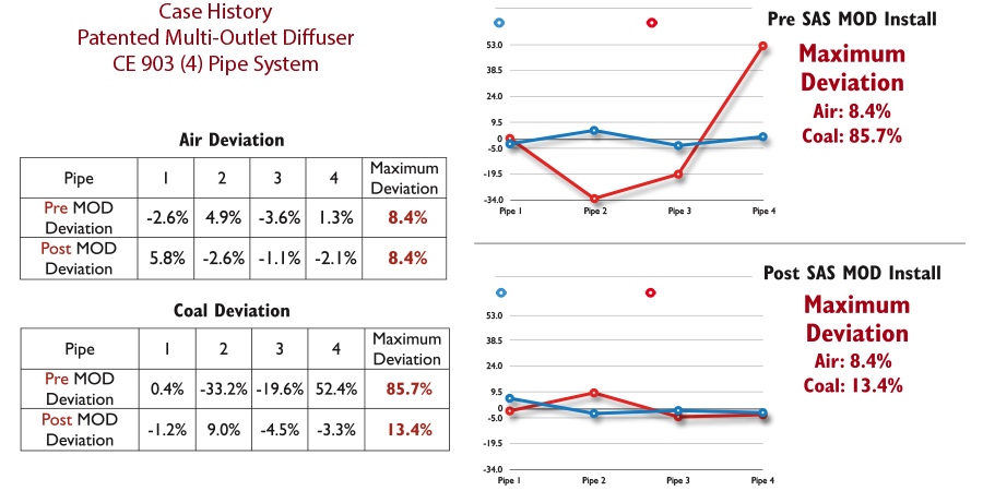 The SAS Multi-Outlet Diffuser breaks up these naturally occurring Coal ribbons and creates a homogeneous mixture of fuel and air exiting the top of the Pulverizer and entering the fuel pipes.