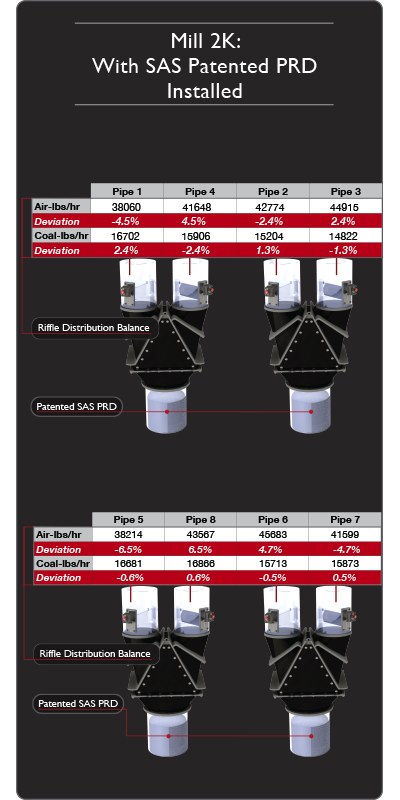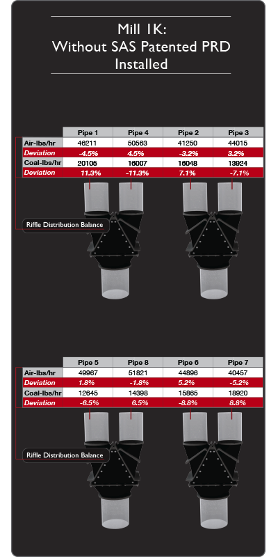 Mill 1K and 2K are identical mills with identical piping configurations. Mill 1K does not have SAS Patented Pre-Riffle Diffusers installed, while Mill 2K does. The charts to the right show a dramatic improvement in the fuel pipe balance thru the riffles.