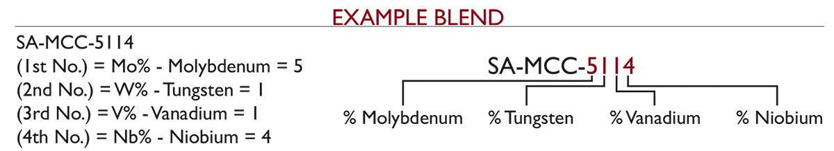 Each specific blend of SA-MCC has its own specific numerical designation. This numerical designation is directly correlated to the percent of each carbide forming element found in the overlay.