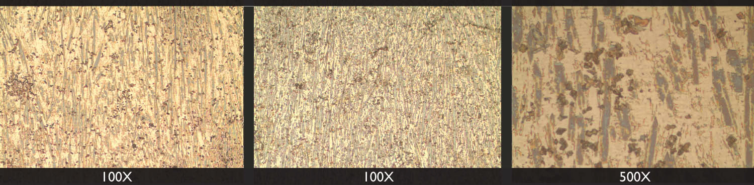 These photomicrographs show electrolytically etched and dyed SA-MCC samples at both 100X and 500X. SA-MCC overlay derives its excellent properties from a combination of type MC, M2C, M7C3, and M6C carbides, which are composed of various amounts of Mo, W, V, Nb, and Cr. The formation of these carbides is controlled by SAS Global’s proprietary overlay process and metallurgical blend, which provide a balance of strength, toughness, and wear resistance.
